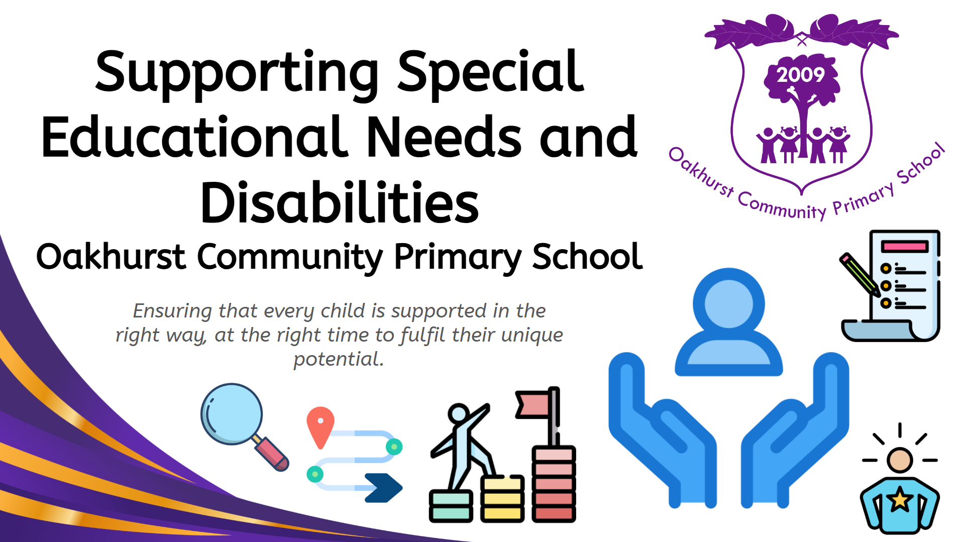 Children may have special educational needs and disabilities either throughout, or at any time during their school life. Oakhurst Community Primary School’s approach ensures that curriculum planning and assessment for children with special educational needs and disabilities takes account of the type and extent of the difficulty experienced by the child.